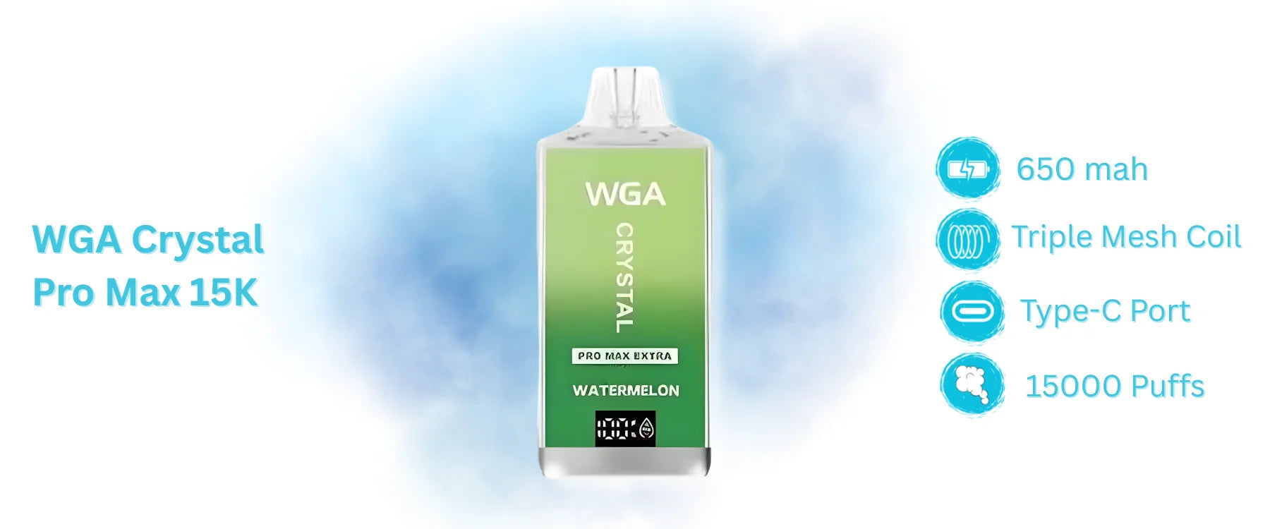 The duckbill mouthpiece feels natural, and the airflow is balanced without adjustment settings, providing steady and smooth vapour. Crystal Vapes are designed for those who hate the “low battery” anxiety and “surprise burnt hit." Its 650 mAh battery typically lasts a full day of moderate use with regular recharging. The WGA 15k is engineered with Triple Mesh Coil technology, ensuring that your last puff is just as cool and cloud-heavy as your first and keeps flavours sharp until the e-liquid runs out, whether you’re a flavor chaser or a bulk-buying pro looking for that perfect Box of 10 deal. WGA brings transparency with its sleek, real-time LED dashboard for battery and e-liquid monitoring, while other disposables leave you guessing when the juice will run dry.
